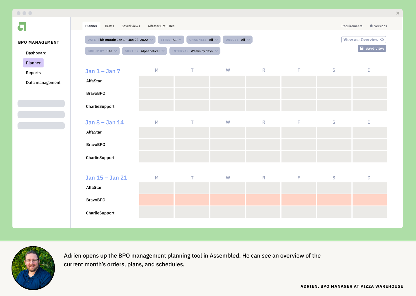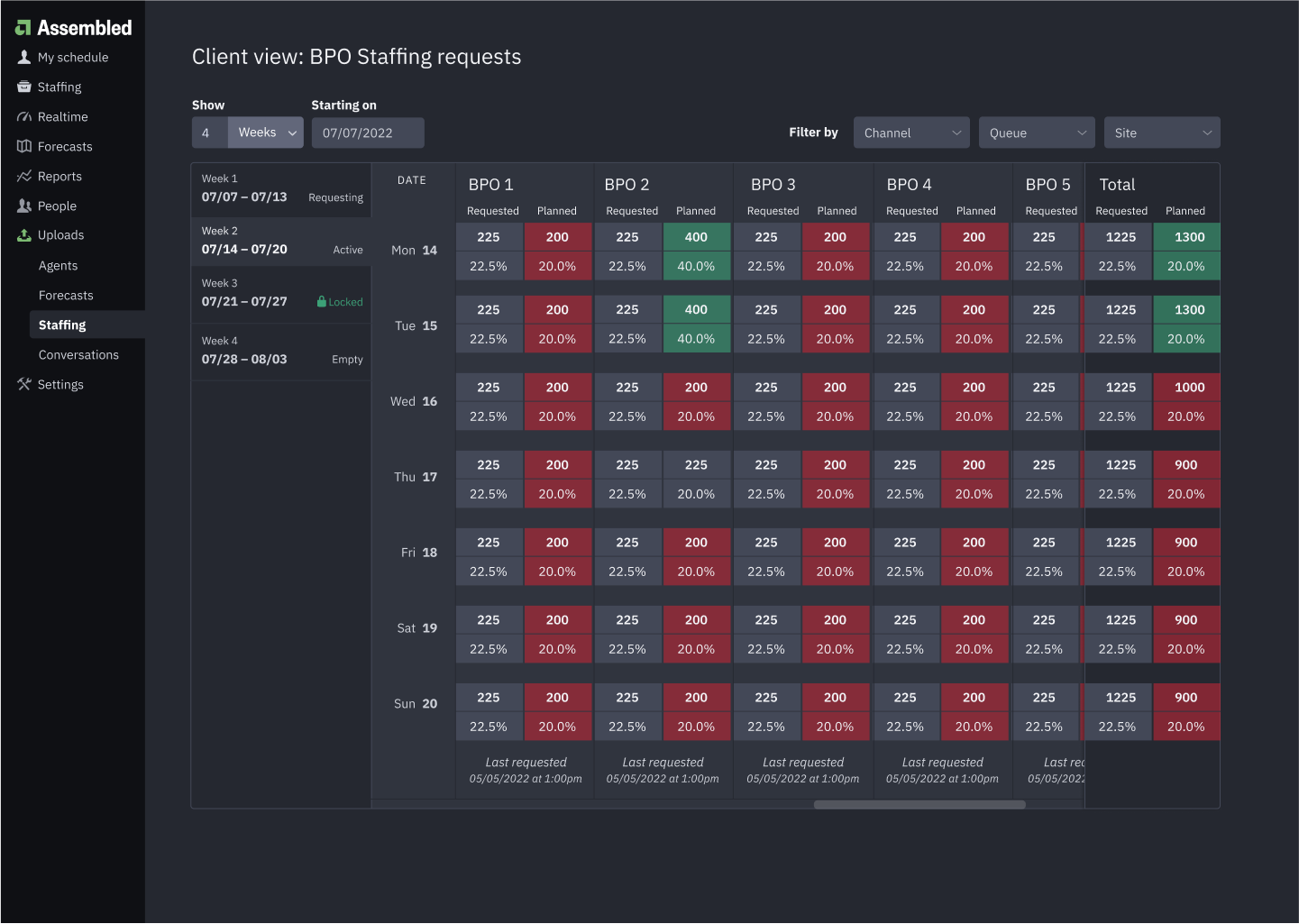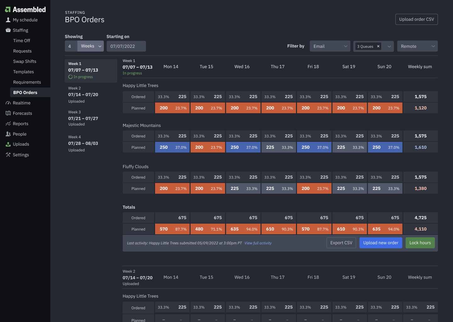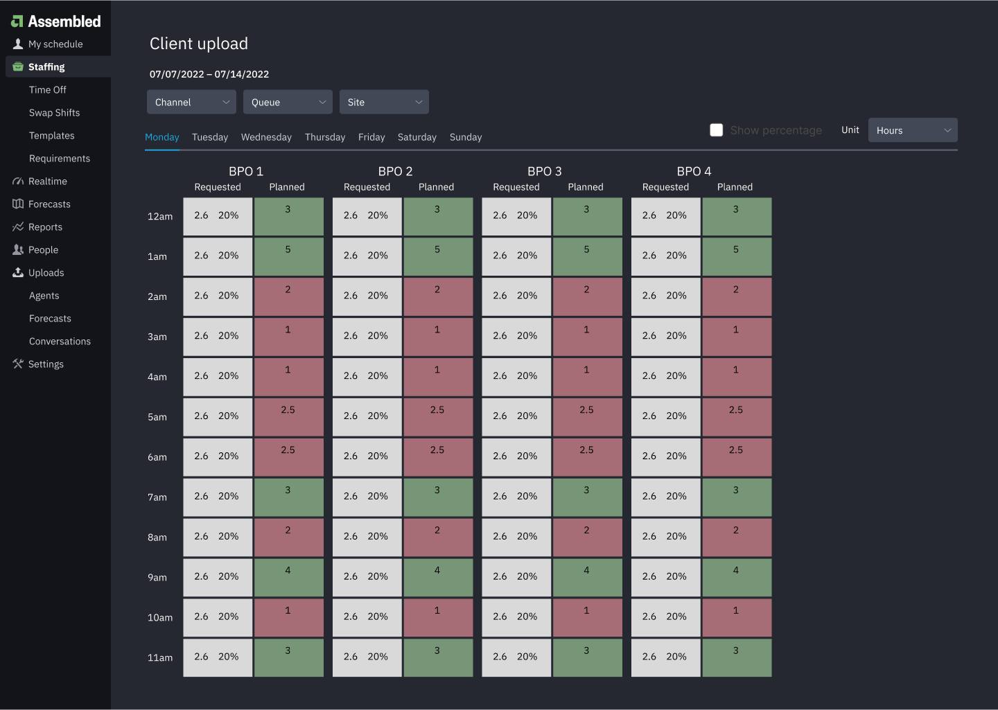 At Assembled, I worked on quite a few projects, but one of the most significant ones was leading the design for a new product called the BPO Manager. Assembled is primarily scheduling software for customer service, along with essential tooling for scheduling like forecasting, realtime analysis, and reporting.