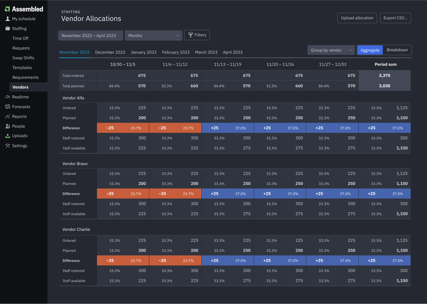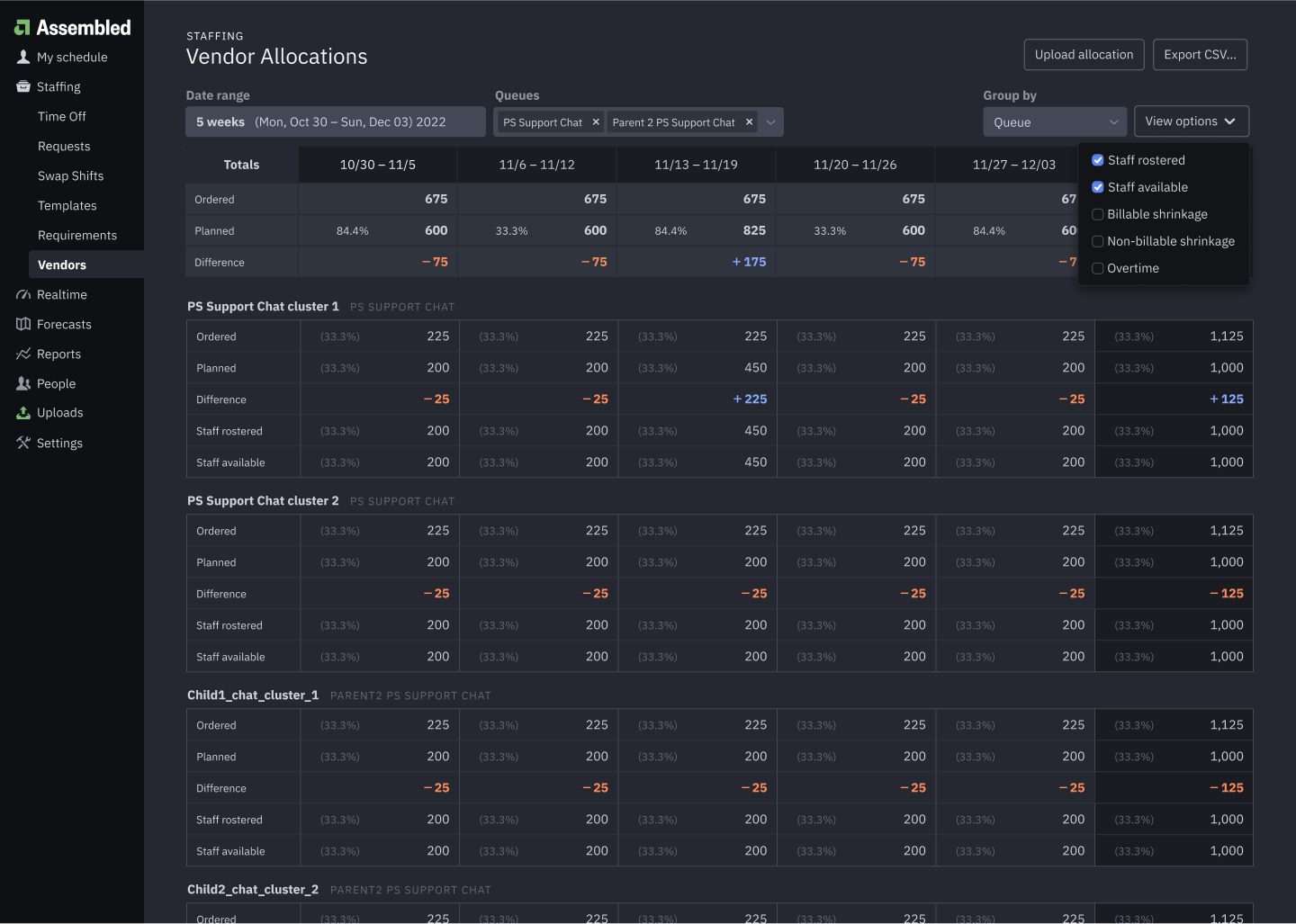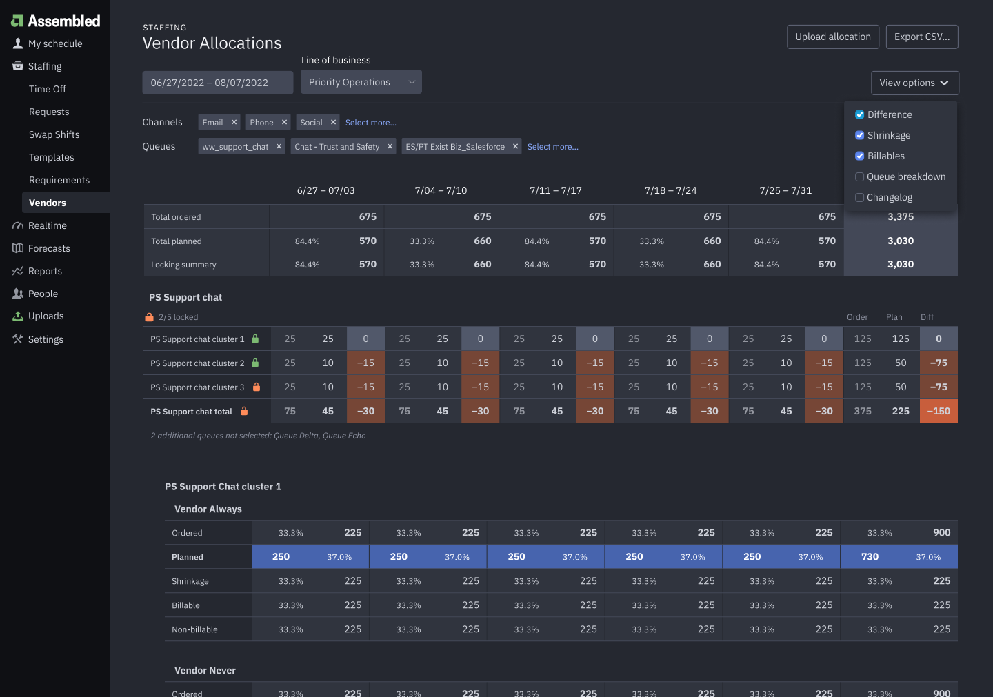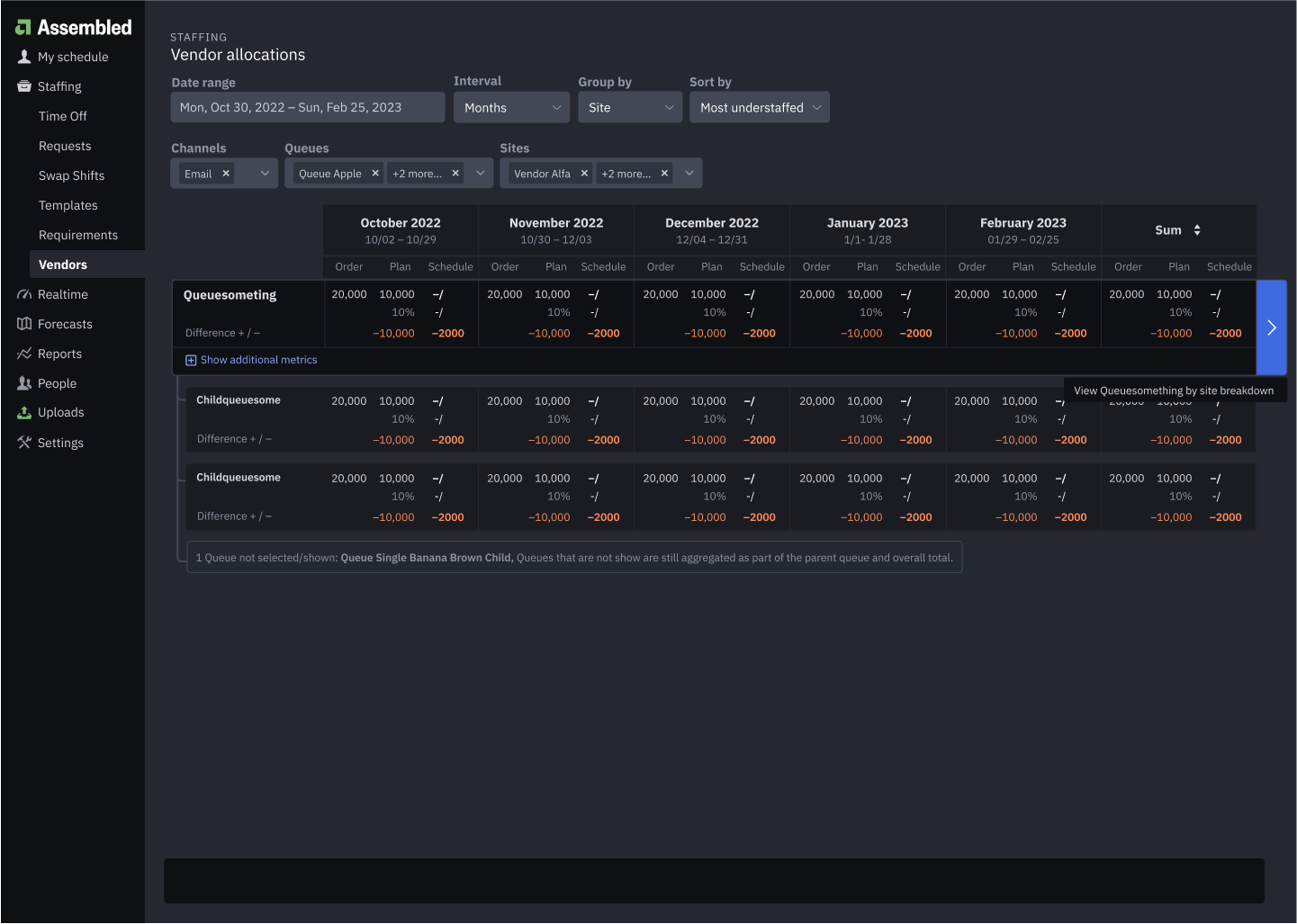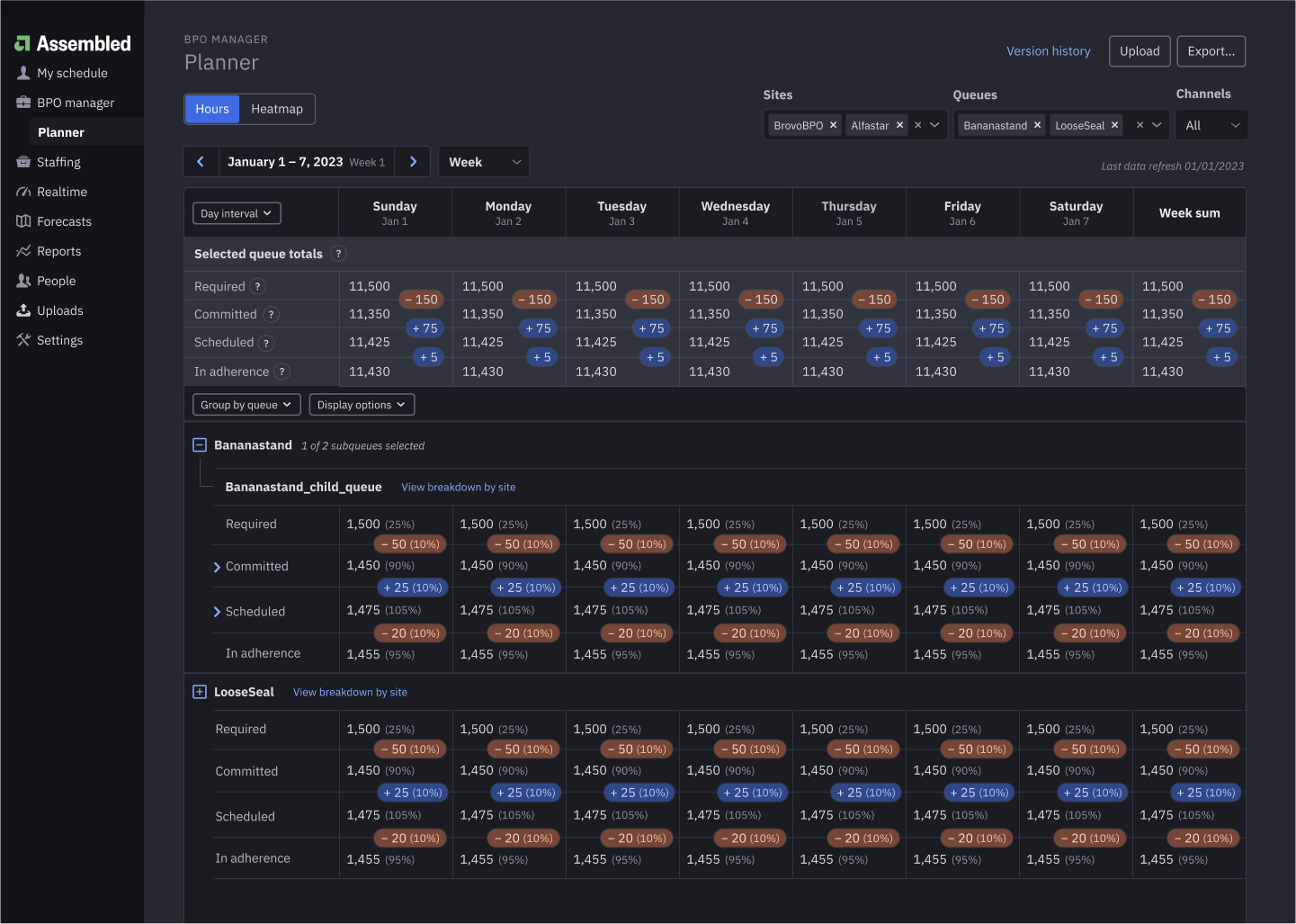 At Assembled, I worked on quite a few projects, but one of the most significant ones was leading the design for a new product called the BPO Manager. Assembled is primarily scheduling software for customer service, along with essential tooling for scheduling like forecasting, realtime analysis, and reporting.