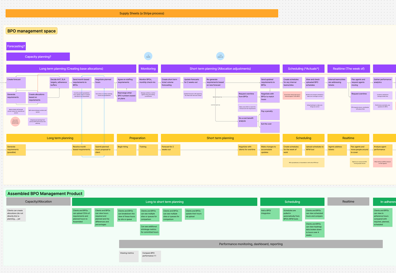 It turned out that everyone had a slightly different understanding of how the BPO process worked, so I got everyone in a room with post-its to figure out exactly what the end-to-end workflow was. The result was a big and complicated diagram that served as a touchpoint throughout the project.